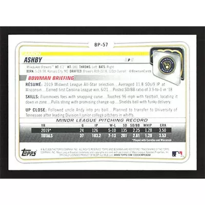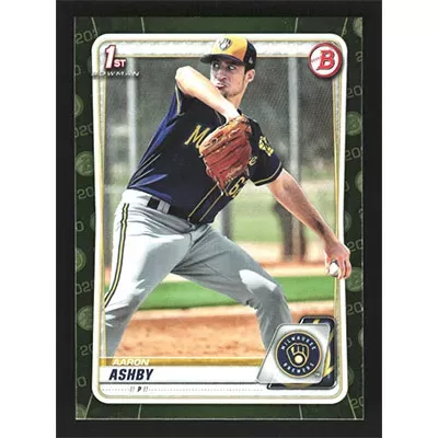 This is a 2020 Bowman Prospects Camo Aaron Ashby baseball card. The card is #BP-57 and pictures show condition.