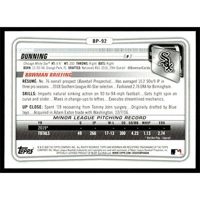 This is a 2020 Bowman Prospects Camo Dane Dunning baseball card. The card is #BP-92 and pictures show condition.