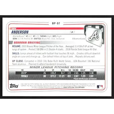 This is a 2020 Bowman Prospects Camo Ian Anderson baseball card. The card is #BP-97 and pictures show condition.