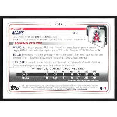 This is a 2020 Bowman Prospects Purple Jordyn Adams baseball card. The card is #BP-15 and pictures show condition. This card is limited; #'d 187/250. Team(s): Los Angeles Angels