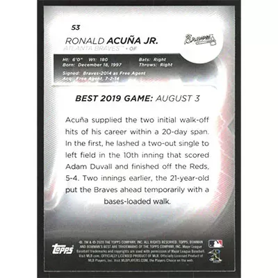This is a 2020 Bowman's Best Ronald Acuña Jr. baseball card. The card is #53 and pictures show condition.