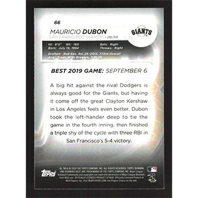 This is a 2020 Bowman's Best Mauricio Dubon baseball card. The card is #66 and pictures show condition. Team(s): San Francisco Giants Rookie Card (RC)