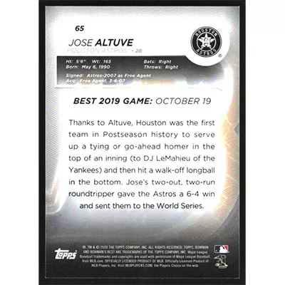 This is a 2020 Bowman's Best Atomic Refractors Jose Altuve baseball card. The card is #65 and pictures show condition.
