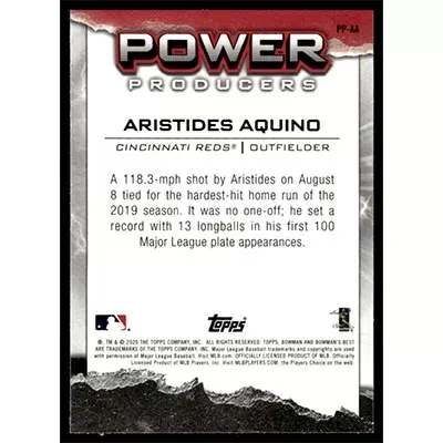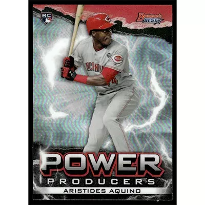 This is a 2020 Bowman's Best Power Producers Aristides Aquino baseball card. The card is #PP-AA and pictures show condition. Team(s): Cincinnati Reds Rookie Card (RC)