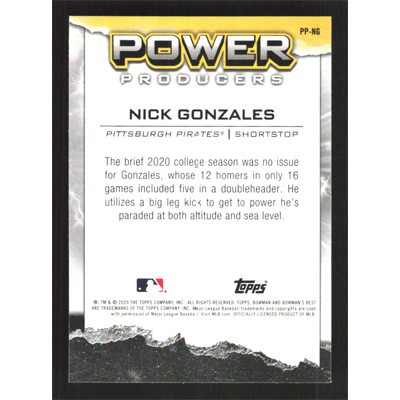This is a 2020 Bowman's Best Power Producers Nick Gonzales baseball card. The card is #PP-NG and pictures show condition.