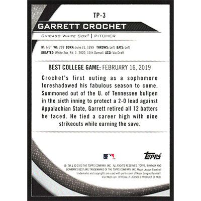 This is a 2020 Bowman's Best Top Prospects Garrett Crochet baseball card. The card is #TP-3 and pictures show condition.