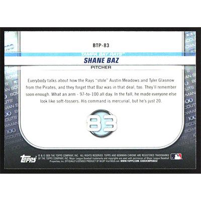 This is a 2020 Bowman Scouts Top 100 Shane Baz baseball card. The card is #BTP-83 and pictures show condition.