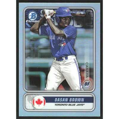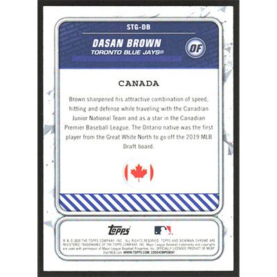 This is a 2020 Bowman Spanning the Globe Dasan Brown baseball card. The card is #STG-DB and pictures show condition.