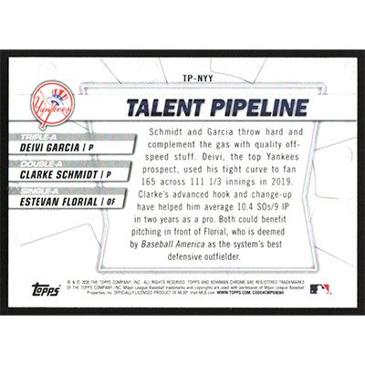 This is a 2020 Bowman Talent Pipeline Estevan Florial, Deivi Garcia and Clarke Schmidt baseball card. The card is #TP-NYY and pictures show condition. Team(s): New York Yankees