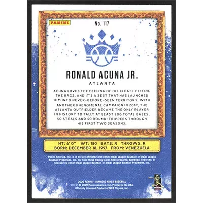 This is a 2020 Diamond Kings Ronald Acuña Jr. SP baseball card. The card is #117 and pictures show condition.