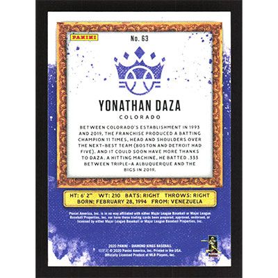 This is a 2020 Diamond Kings Yonathan Daza baseball card. The card is #63 and pictures show condition.