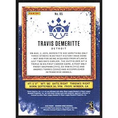 This is a 2020 Diamond Kings Travis Demeritte baseball card. The card is #85 and pictures show condition.