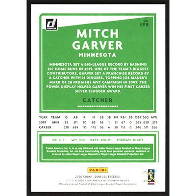 This is a 2020 Donruss Mitch Garver baseball card. The card is #198 and pictures show condition.