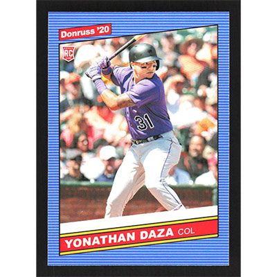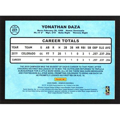 This is a 2020 Donruss Yonathan Daza Retro baseball card. The card is #241 and pictures show condition.