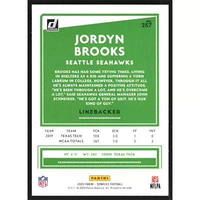 This is a 2020 Donruss Jordyn Brooks football card. The card is #257 and pictures show condition.