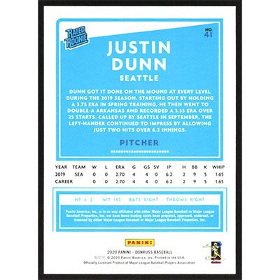 This is a 2020 Donruss Justin Dunn Rated Rookie baseball card. The card is #41 and pictures show condition. Team(s): Seattle Mariners Rookie Card (RC)