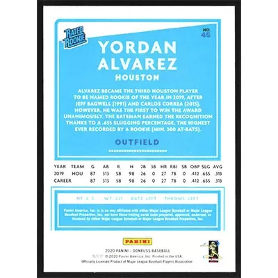 This is a 2020 Donruss Yordan Alvarez Rated Rookie baseball card. The card is #45 and pictures show condition. Team(s): Houston Astros Rookie Card (RC)