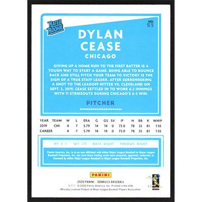 This is a 2020 Donruss Dylan Cease Rated Rookie baseball card. The card is #53 and pictures show condition. Team(s): Chicago White Sox Rookie Card (RC)