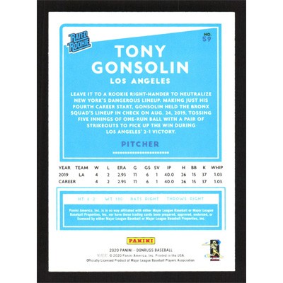 This is a 2020 Donruss Tony Gonsolin Rated Rookie baseball card. The card is #59 and pictures show condition. Team(s): Los Angeles Dodgers Rookie Card (RC)