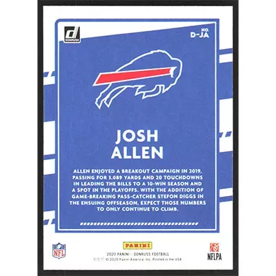 This is a 2020 Donruss Dominators Josh Allen football card. The card is #D-JA and pictures show condition.