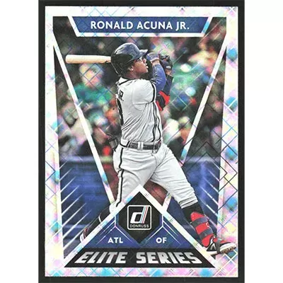 This is a 2020 Donruss Elite Series Diamond Ronald Acuña Jr. baseball card. The card is #E-8 and pictures show condition.