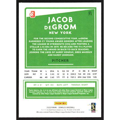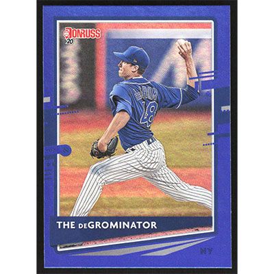This is a 2020 Donruss Holo Blue Variations Jacob deGrom Nickname baseball card. The card is #71 and pictures show condition.