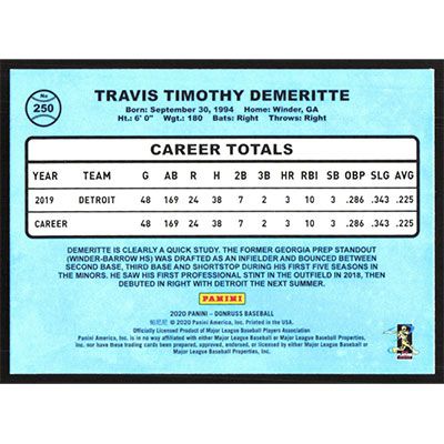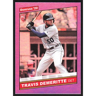 This is a 2020 Donruss Holo Pink Travis Demeritte Retro baseball card. The card is #250 and pictures show condition. Team(s): Detroit Tigers Rookie Card (RC)
