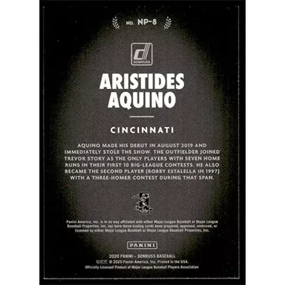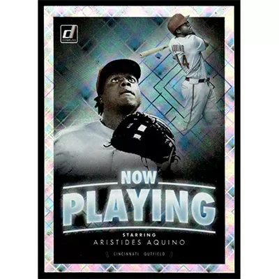 This is a 2020 Donruss Now Playing Diamond Aristides Aquino baseball card. The card is #NP-8 and pictures show condition.