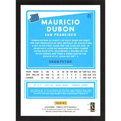 This is a 2020 Donruss Optic Mauricio Dubon Rated Rookie baseball card. The card is #33 and pictures show condition. Team(s): San Francisco Giants Rookie Card (RC)