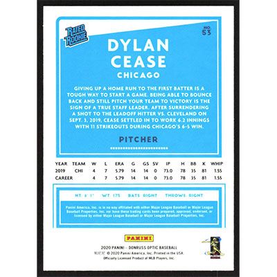 This is a 2020 Donruss Optic Dylan Cease Rated Rookie baseball card. The card is #53 and pictures show condition. Team(s): Chicago White Sox Rookie Card (RC)