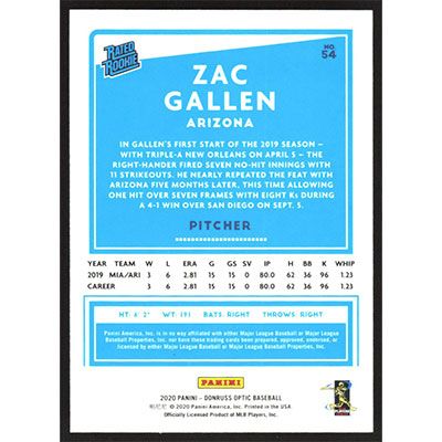 This is a 2020 Donruss Optic Zac Gallen Rated Rookie baseball card. The card is #54 and pictures show condition. Team(s): Arizona Diamondbacks Rookie Card (RC)