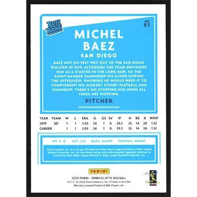 This is a 2020 Donruss Optic Michel Baez Rated Rookie baseball card. The card is #83 and pictures show condition. Team(s): San Diego Padres Rookie Card (RC)