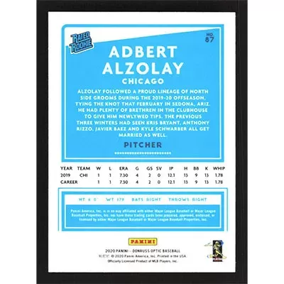 This is a 2020 Donruss Optic Adbert Alzolay Rated Rookie baseball card. The card is #87 and pictures show condition. Team(s): Chicago Cubs Rookie Card (RC)