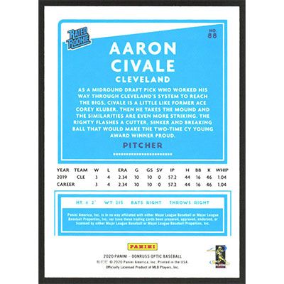 This is a 2020 Donruss Optic Aaron Civale Rated Rookie baseball card. The card is #88 and pictures show condition. Team(s): Cleveland Indians Rookie Card (RC)