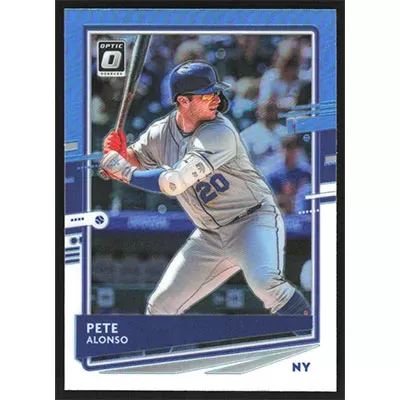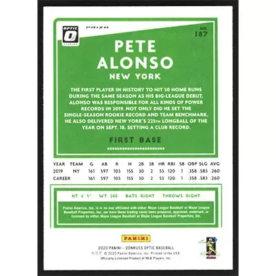 This is a 2020 Donruss Optic Carolina Blue and White Pete Alonso baseball card. The card is #187 and pictures show condition.