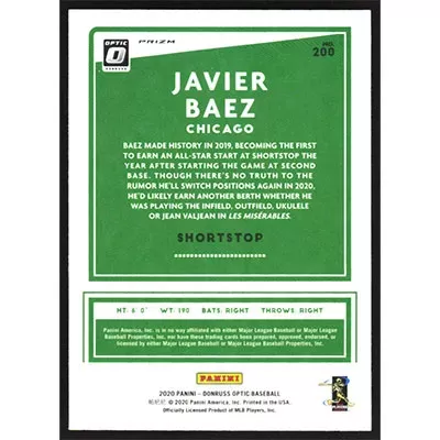 This is a 2020 Donruss Optic Carolina Blue and White Javier Baez All-Stars baseball card. The card is #200 and pictures show condition. Team(s): Chicago Cubs