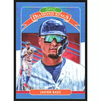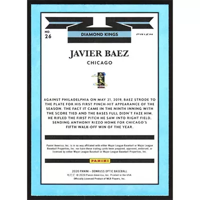 This is a 2020 Donruss Optic Carolina Blue and White Javier Baez Diamond Kings baseball card. The card is #26 and pictures show condition. Team(s): Chicago Cubs