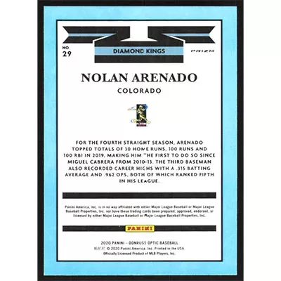 This is a 2020 Donruss Optic Carolina Blue and White Nolan Arenado Diamond Kings baseball card. The card is #29 and pictures show condition. Team(s): Colorado Rockies
