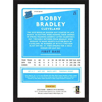This is a 2020 Donruss Optic Carolina Blue and White Bobby Bradley Rated Rookie baseball card. The card is #63 and pictures show condition. Team(s): Cleveland Indians Rookie Card (RC)