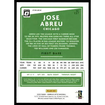 This is a 2020 Donruss Optic Holo Jose Abreu baseball card. The card is #127 and pictures show condition.