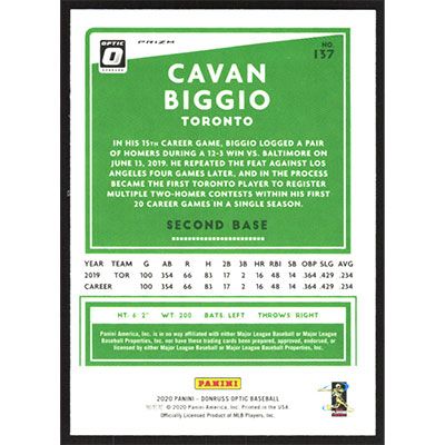 This is a 2020 Donruss Optic Holo Cavan Biggio baseball card. The card is #137 and pictures show condition.