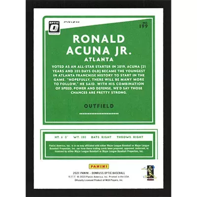 This is a 2020 Donruss Optic Holo Ronald Acuña Jr. All-Stars baseball card. The card is #199 and pictures show condition.