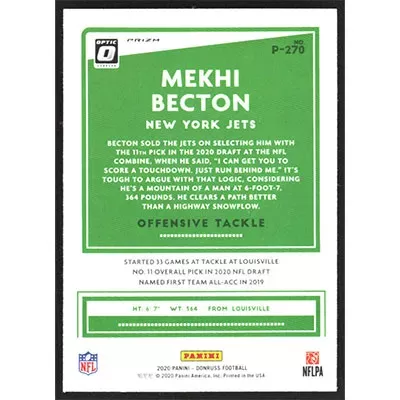 This is a 2020 Donruss Optic Preview Red and Green Mekhi Becton football card. The card is #P-270 and pictures show condition. Team: New York Jets Rookie Card