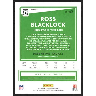This is a 2020 Donruss Optic Preview Red and Green Ross Blacklock football card. The card is #P-283 and pictures show condition. Team: Houston Texans Rookie Card