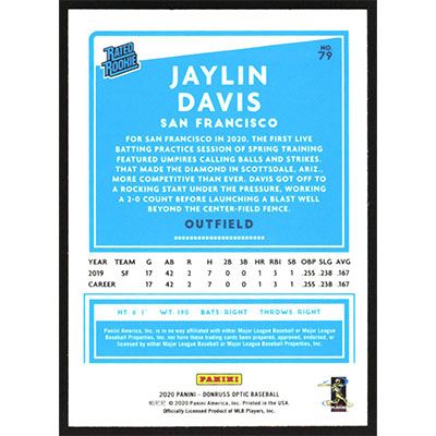 This is a 2020 Donruss Optic Jaylin Davis Rated Rookie baseball card. The card is #RRS-JD and pictures show condition. Team(s): San Francisco Giants Rookie Card (RC)