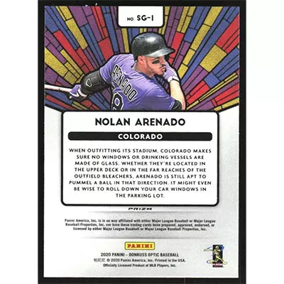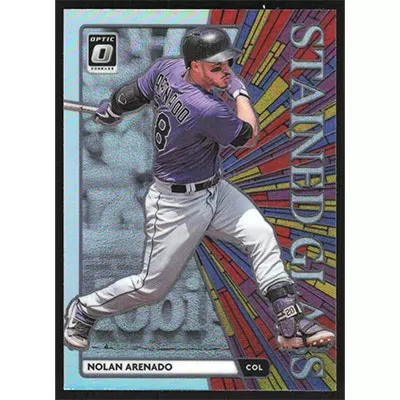 This is a 2020 Donruss Optic Stained Glass Holo Nolan Arenado baseball card. The card is #SG-1 and pictures show condition.