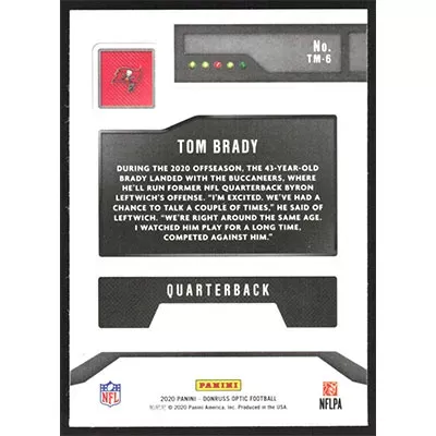 This is a 2020 Donruss Optic T-Minus 3 2 1 Tom Brady football card. The card is #TM-6 and pictures show condition.