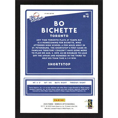This is a 2020 Donruss Optic The Rookies Holo Bo Bichette baseball card. The card is #R-6 and pictures show condition. Team(s): Toronto Blue Jays Rookie Card (RC)
