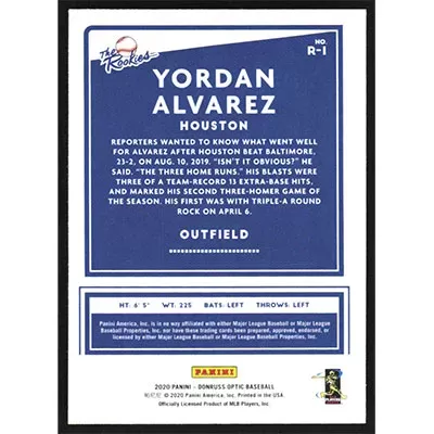 This is a 2020 Donruss Optic The Rookies Yordan Alvarez baseball card. The card is #R-1 and pictures show condition. Team(s): Houston Astros Rookie Card (RC)