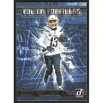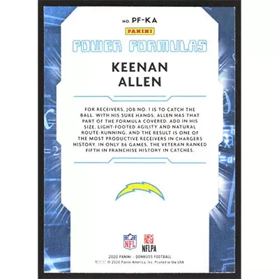 This is a 2020 Donruss Power Formulas Keenan Allen football card. The card is #PF-KA and pictures show condition.